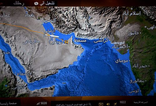 Von Düsseldorf zur Zwischenlandung nach Abu Dhabi geht die reguläre Route eigentlich über den Irak, entlang der irakisch/iranischen Grenze.